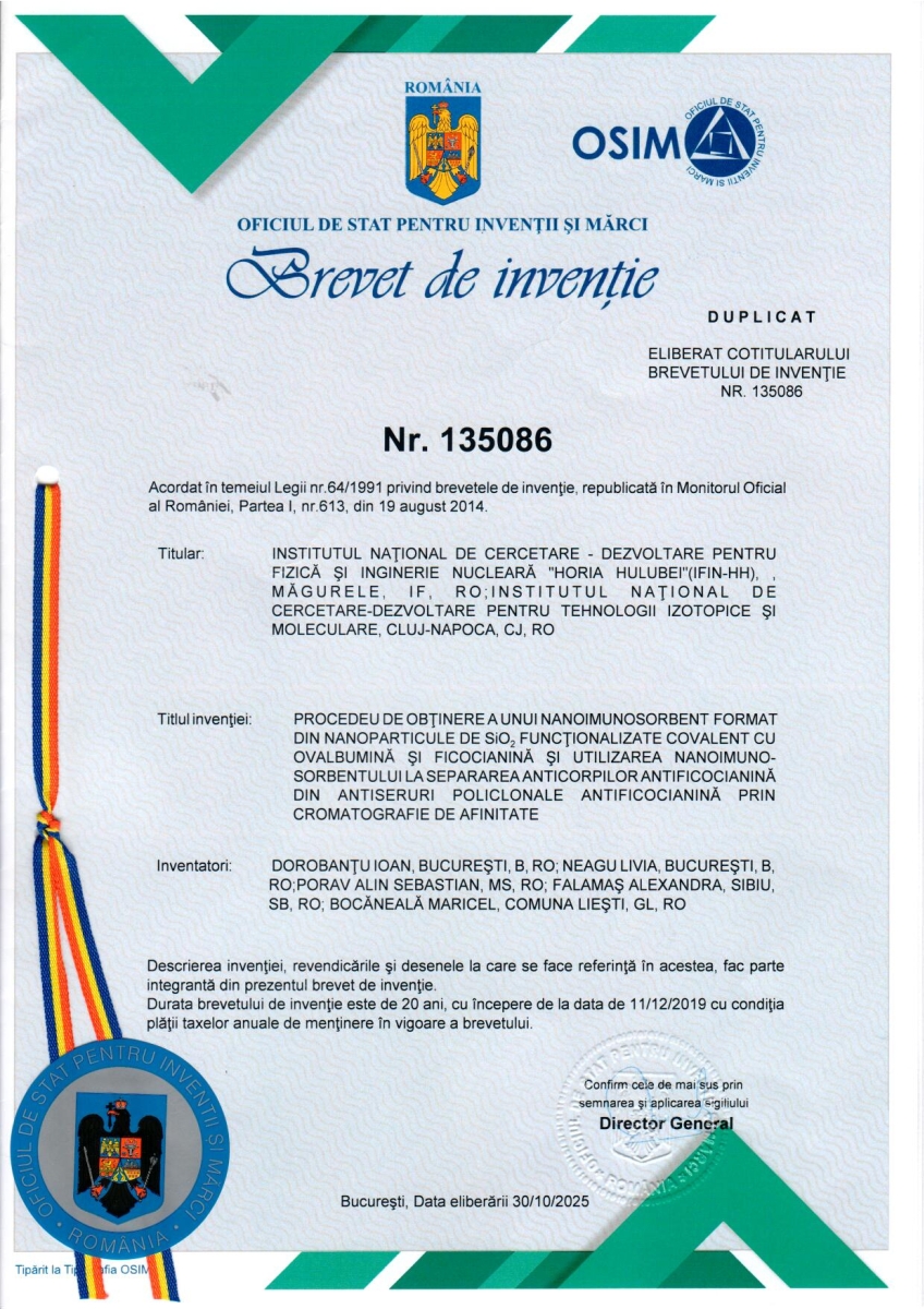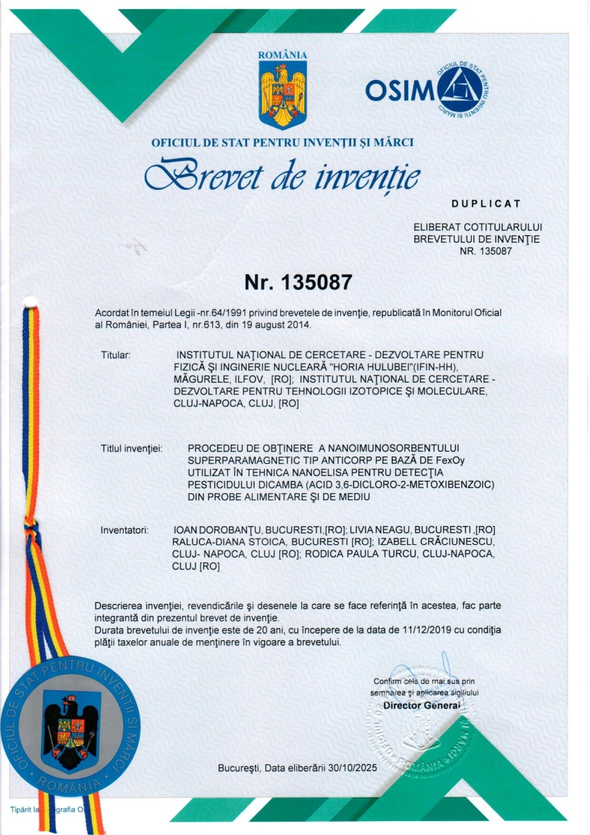 Titlu: Procedeu de obţinere a nanoimunosorbentului superparamagnetic tip anticorp pe bază de FexOy utilizat în tehnica nanoElisa pentru detecţia pesticidului DICAMBA (acid 3,6-dicloro-2-metoxibenzoic) din probe alimentare şi de mediu