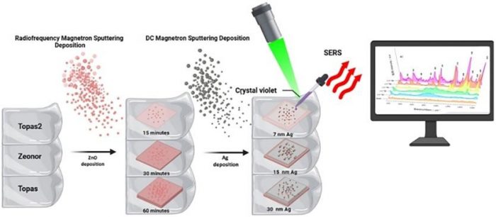 Analiza SEM a arătat că atomii de Ag au migrat atât în zonele interstițiale, umplând golurile dintre structurile granulare de ZnO, cât și deasupra acestora, formând în acest caz clustere izolate de Ag. Analiza SERS realizată pe filmele hibride ZnO@Ag utilizând molecula cristal violet a evidențiat o limită de detecție de 10⁻⁷ M în cazul filmelor cu strat intermediar ZnO și Ag de 15 nm pe Zeonor®, precum și o reproductibilitate ridicată a semnalului (RSD sub 10%).