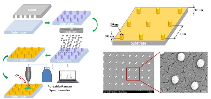 Procesul permite detectarea în timp real a substanțelor organice cu impact poluant asupra mediului, folosind un spectrometru Raman portabil cu laser de 532 nm. Măsurătorile SERS sunt realizate pe molecula test cristal violet (CV) și la diferite grosimi ale filmului de Au de 25 nm, 50 nm, 100 nm și 200 nm.